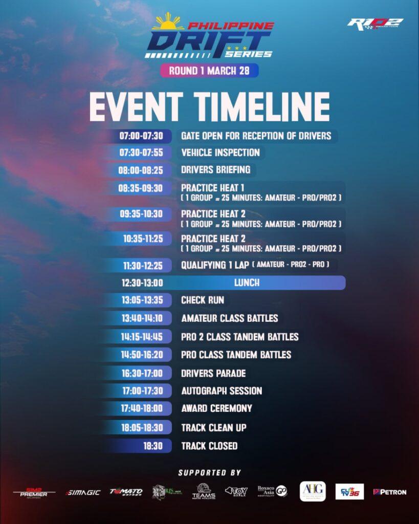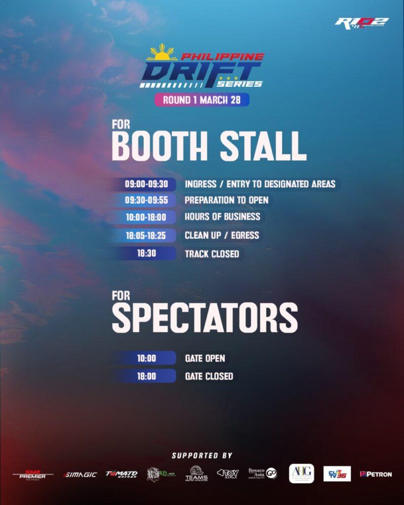 The Philippine Drift Series: Round 1 is organized by R102 Productions and supported by the Official Hotel Accommodation Partner: RAHC – Go Hotels, the Official Media Partner: CLTV36, SIMAGIC, Sim² Premier, Tomato Garage, AHG Hotels and Resorts, Atoy Customs, Petron Corporation, RJ’s Social, and TEAMS Marine. #