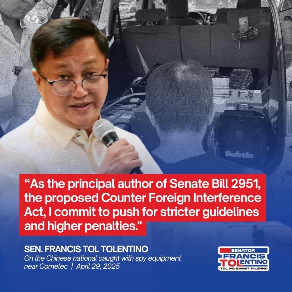 Ayon kay Tolentino, malinaw na ebidensya ito ng isinasagawang mga lihim na operasyon upang maimpluwensyahan ang halalan sa bansa.