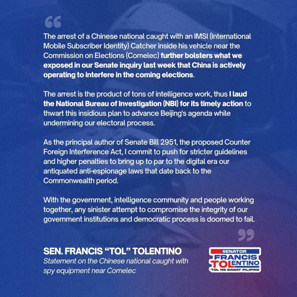 Pinuri naman ni Tolentino ang mabilis na aksyon ng NBI na aniya’y naging susi sa pagpigil ng umano’y mapanlinlang na plano para isulong ang interes ng Beijing.